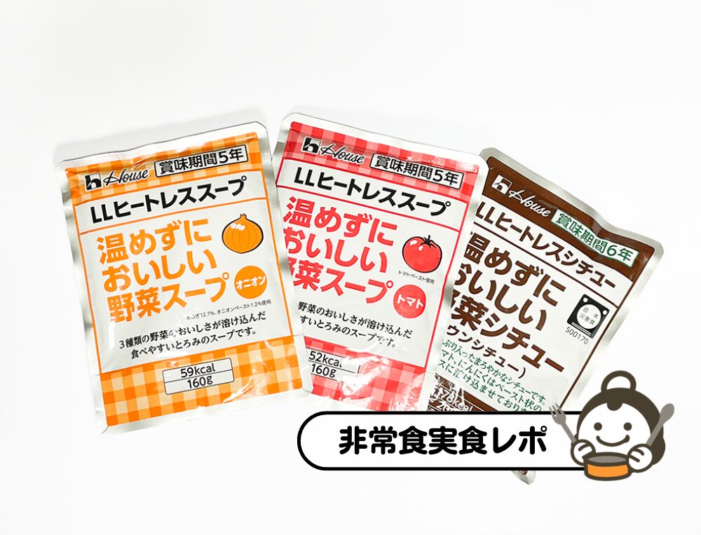 今回ご紹介する非常食はこちら!ハウス食品『LLヒートレススープ』と『LLヒートレスシチュー』